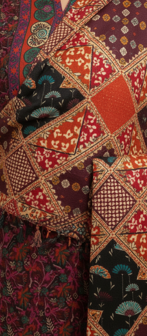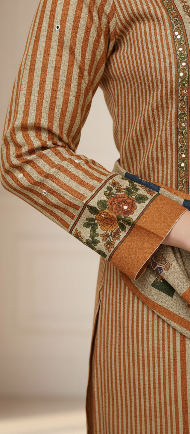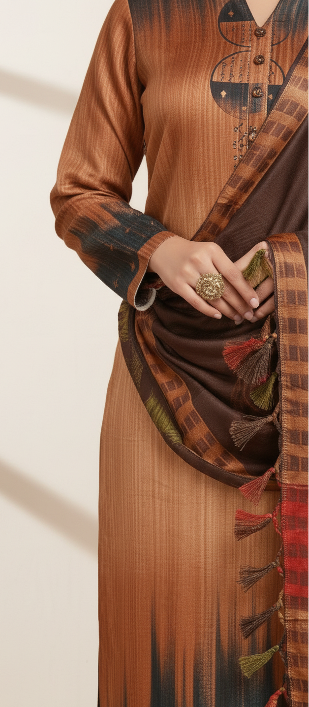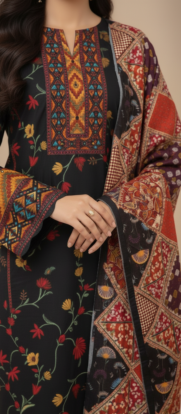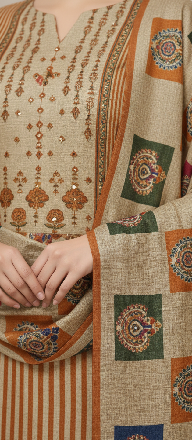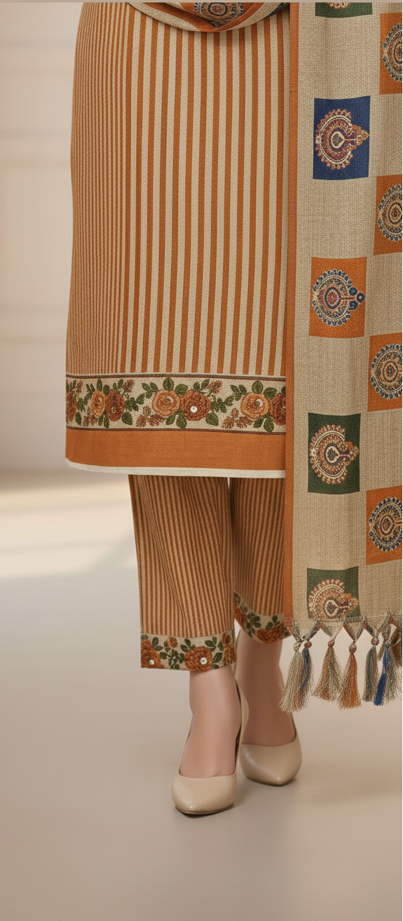 NOTE: This is an UNSTICHED winter pashmina suit set with a printed shawl; model image is only for reference.
